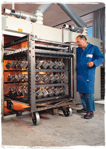 In our vacuum potting machine, inductive components are dried, extracted from gas, moulded in vacuum and hardened with high temperature in a storage oven. The whole process is running fully automatic.
